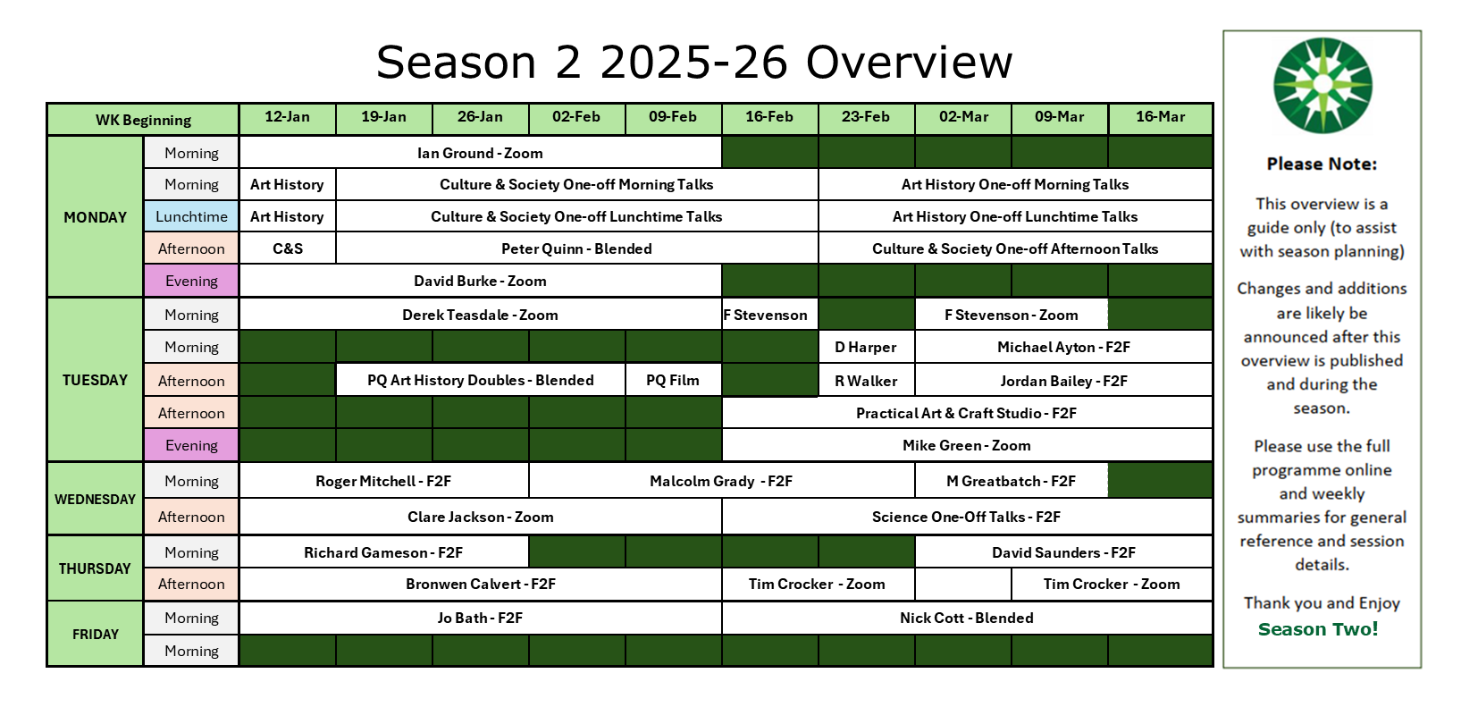 A team of member volunteers plans the Explore programmes under the guidance of tutor trustees Anthea Lang and Malcolm Grady. The team is divided into the following subject areas :